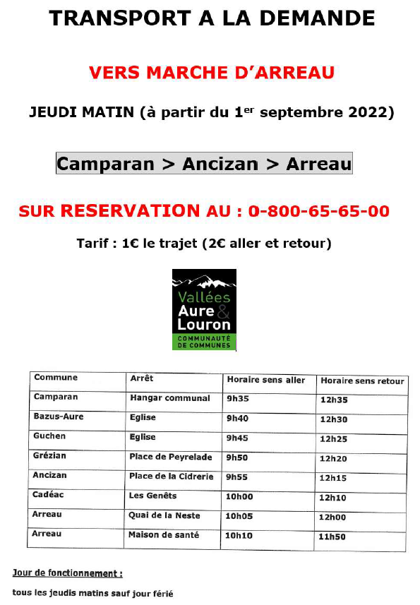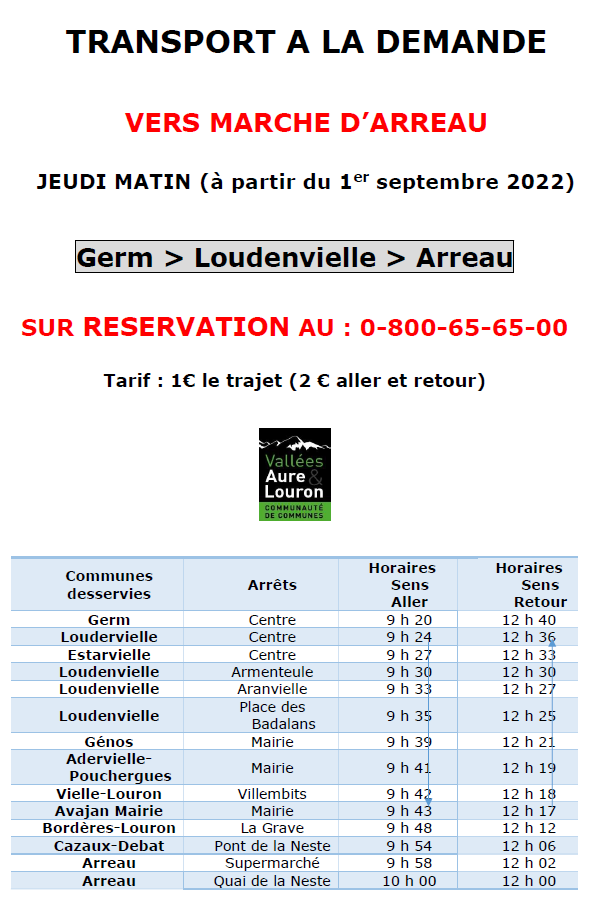 Depuis le jeudi 1er septembre 2022, la Communauté de communes Aure Louron déploie 2 lignes de transport à la demande vers le marché d’Arreau tous les jeudis.
