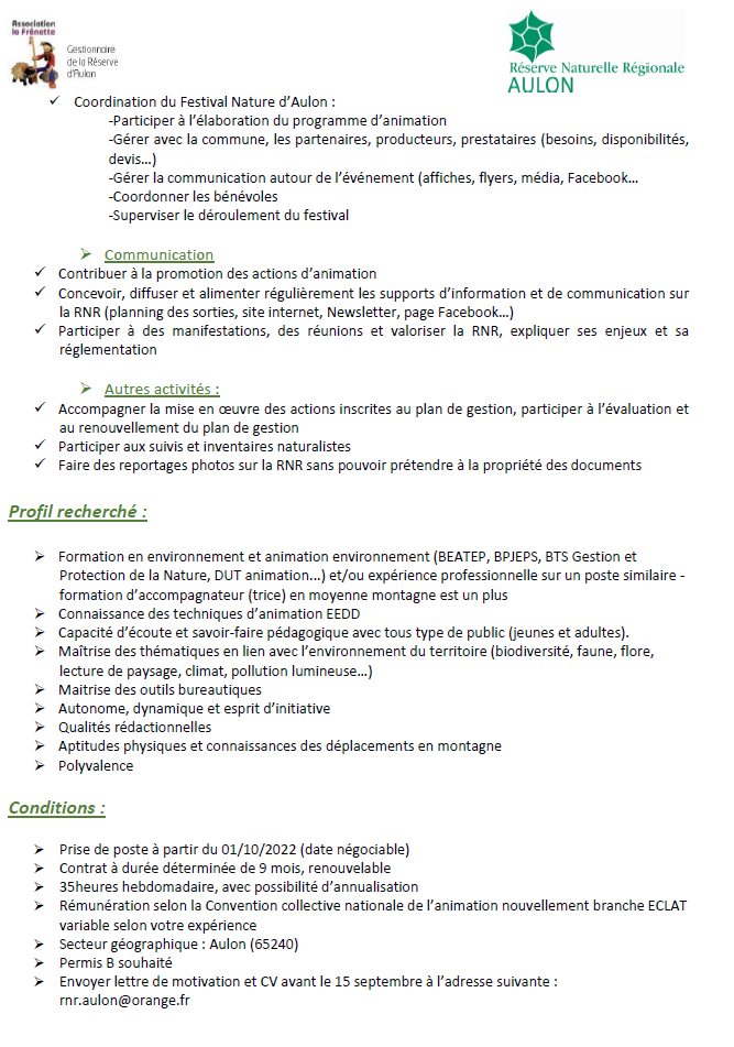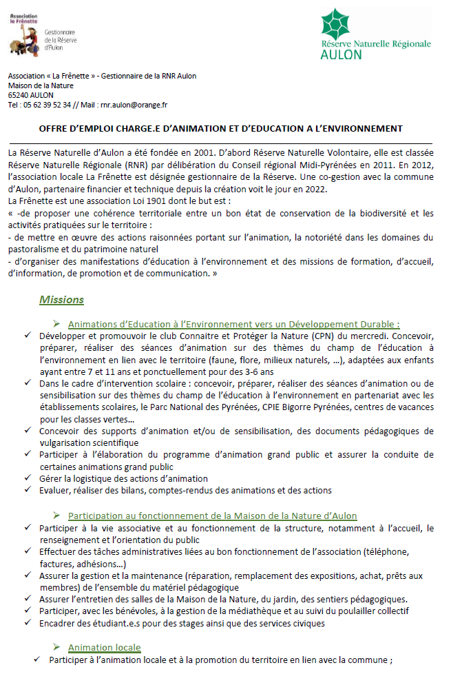 RNR D’AULON : Offre d’emploi chargé.e d’animation et d’éducation à l’environnement