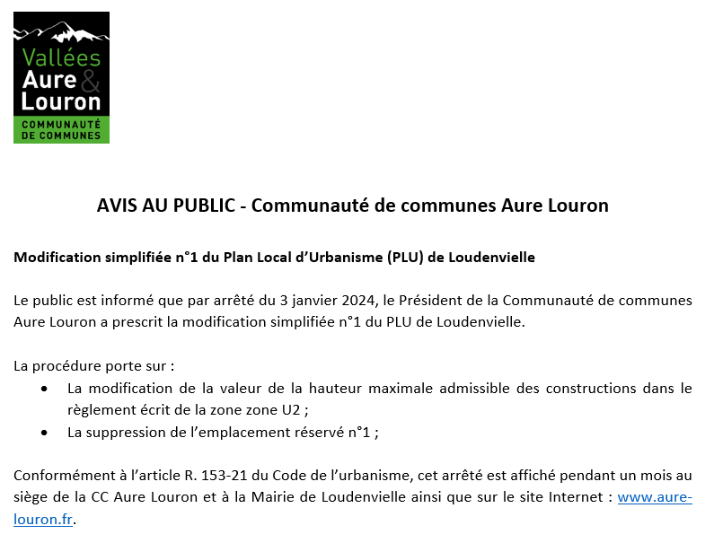 Avis au public : modification simplifiée n°1 du PLU de Loudenvielle