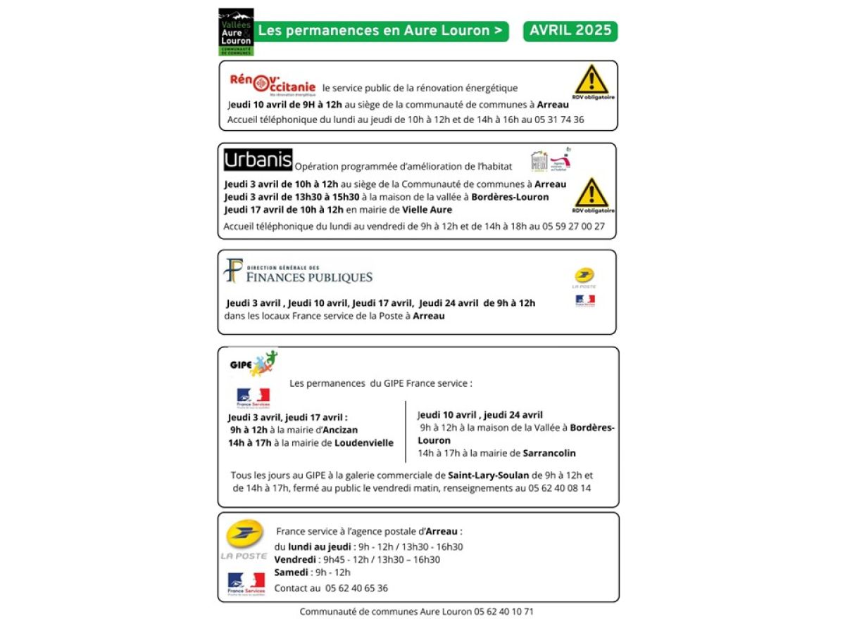 Les permanences en Avril 2025 : DDFIP, Renov'Occitanie, OPAH, France Services, Maison du travail saisonnier, CIDDF, Mission Locale, Accompagnement social